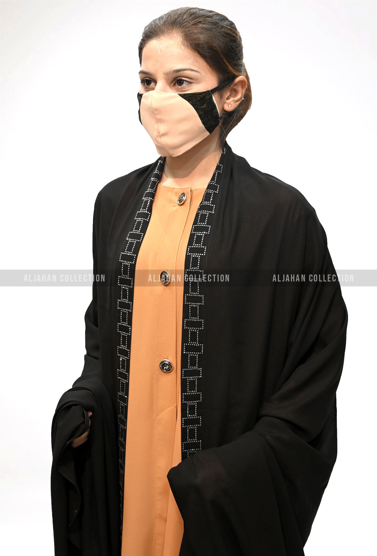 Enhance your modest wardrobe with Aljahan’s Chaddar with Stone Work in a sophisticated chain design. This black chaddar is beautifully adorned with delicate stone embellishments, forming an elegant chain pattern that adds a touch of luxury and refinement. Crafted from premium-quality fabric, it offers a lightweight and breathable feel, making it perfect for daily wear, prayer, and special occasions. Designed for effortless draping, this chaddar is a timeless addition to any modest fashion collection.